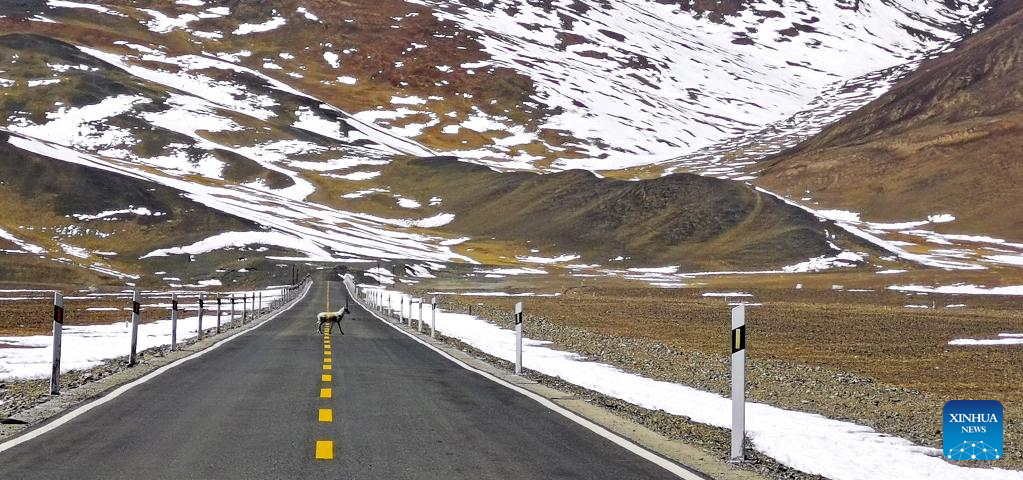 Photo taken with a mobile phone shows a Tibetan antelope walking across a road in Rutog County, southwest China's Tibet Autonomous Region, April 9, 2022. Tibet has become an ideal habitat for wild animals over the years amid the region's thriving biodiversity protection endeavors.