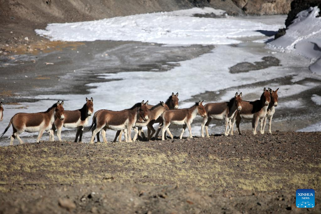 Photo taken on April 8, 2022 shows a herd of Tibetan wild donkeys in Rutog County, southwest China's Tibet Autonomous Region. Tibet has become an ideal habitat for wild animals over the years amid the region's thriving biodiversity protection endeavors.