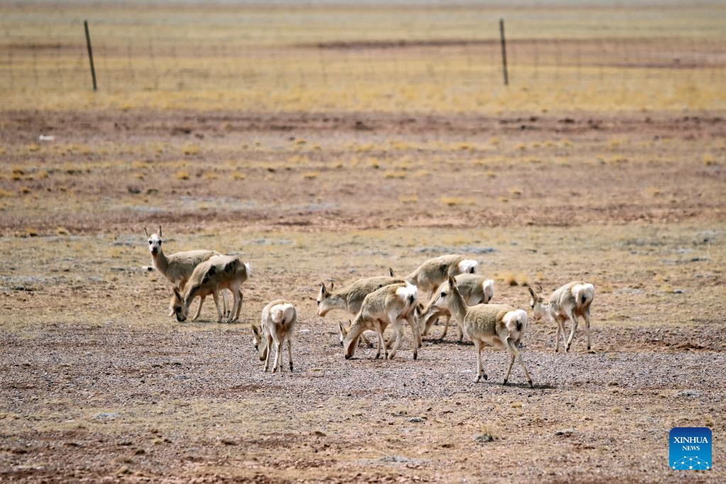 Photo taken on April 12, 2022 shows a herd of Tibetan gazelles in Gerze County, southwest China's Tibet Autonomous Region. Tibet has become an ideal habitat for wild animals over the years amid the region's thriving biodiversity protection endeavors.