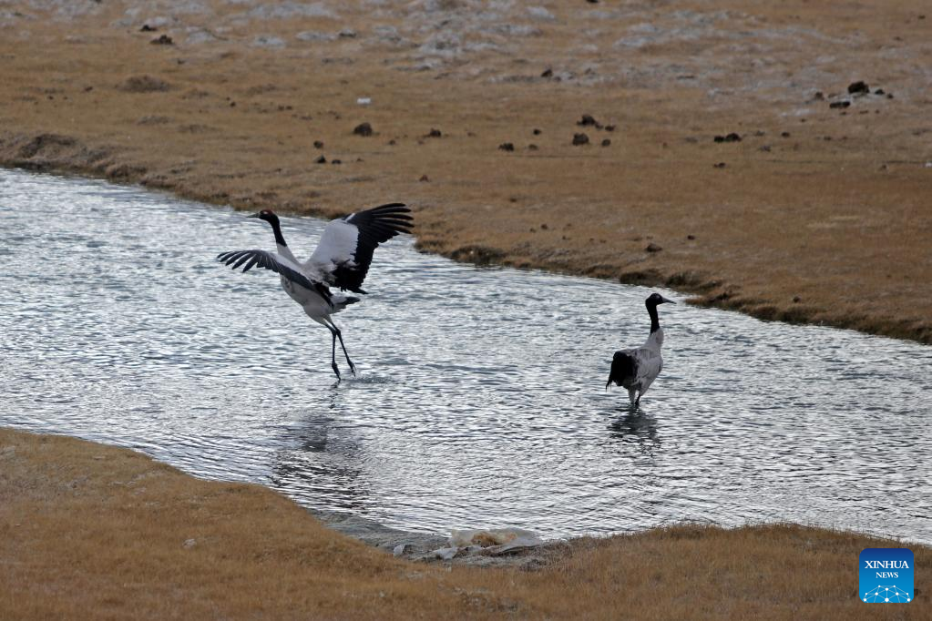 Photo taken on April 9, 2022 shows black-necked cranes in Rutog County, southwest China's Tibet Autonomous Region. Tibet has become an ideal habitat for wild animals over the years amid the region's thriving biodiversity protection endeavors.