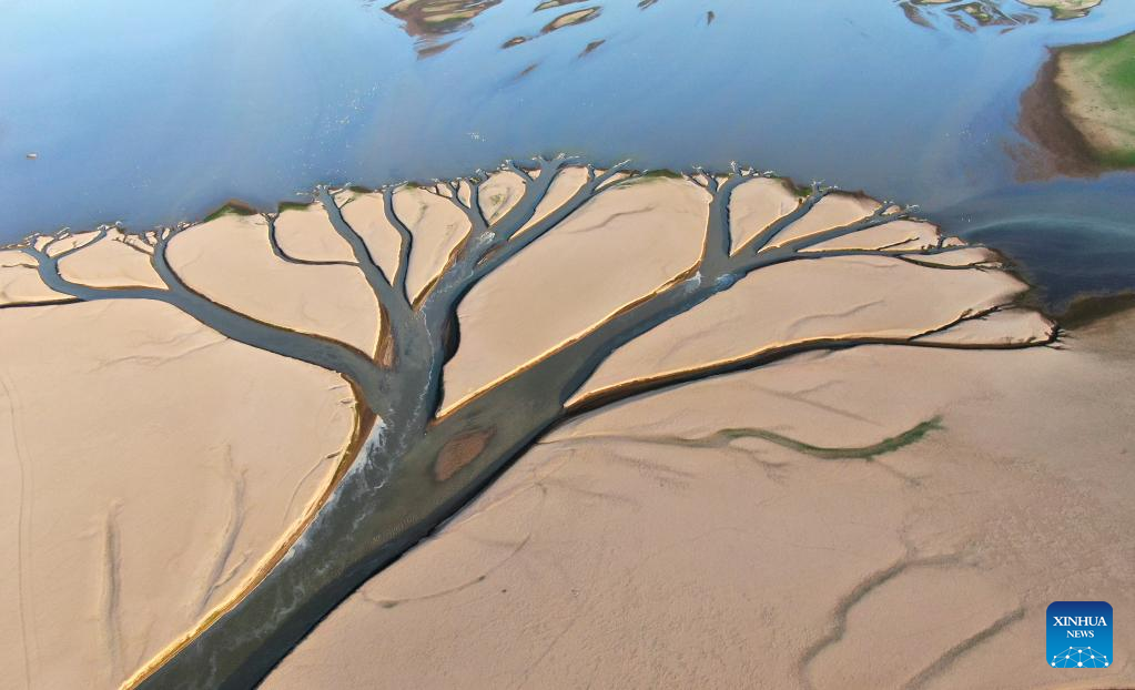 Aerial photo taken on Aug. 22, 2022 shows the tidal-flat presenting a landscape of a tree in Jinxian section of Poyang Lake in east China's Jiangxi Province. (Xinhua/Wan Xiang)