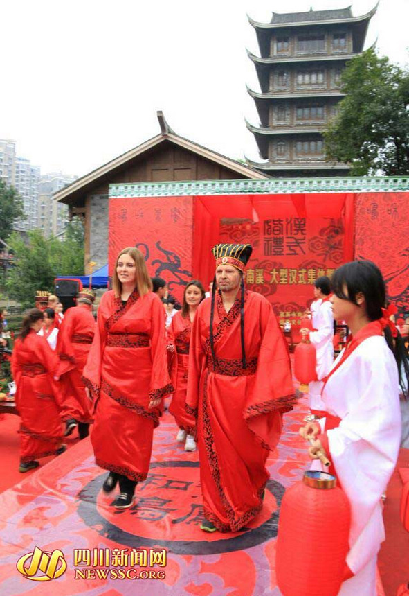 A group of European panda fans experienced a tranditional Chinese wedding ceremony held in Yibin City, Sichuan Province on Aug. 25, 2015, as part of the ongoing 2015 Sichuan International Cultural Tourism Festival. [Photo from NEWSSC.ORG]