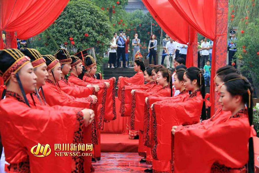 A group of European panda fans experienced a tranditional Chinese wedding ceremony held in Yibin City, Sichuan Province on Aug. 25, 2015, as part of the ongoing 2015 Sichuan International Cultural Tourism Festival. [Photo from NEWSSC.ORG]