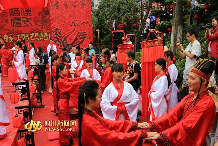 A group of European panda fans experienced a tranditional Chinese wedding ceremony held in Yibin City, Sichuan Province on Aug. 25, 2015, as part of the ongoing 2015 Sichuan International Cultural Tourism Festival. [Photo from NEWSSC.ORG]