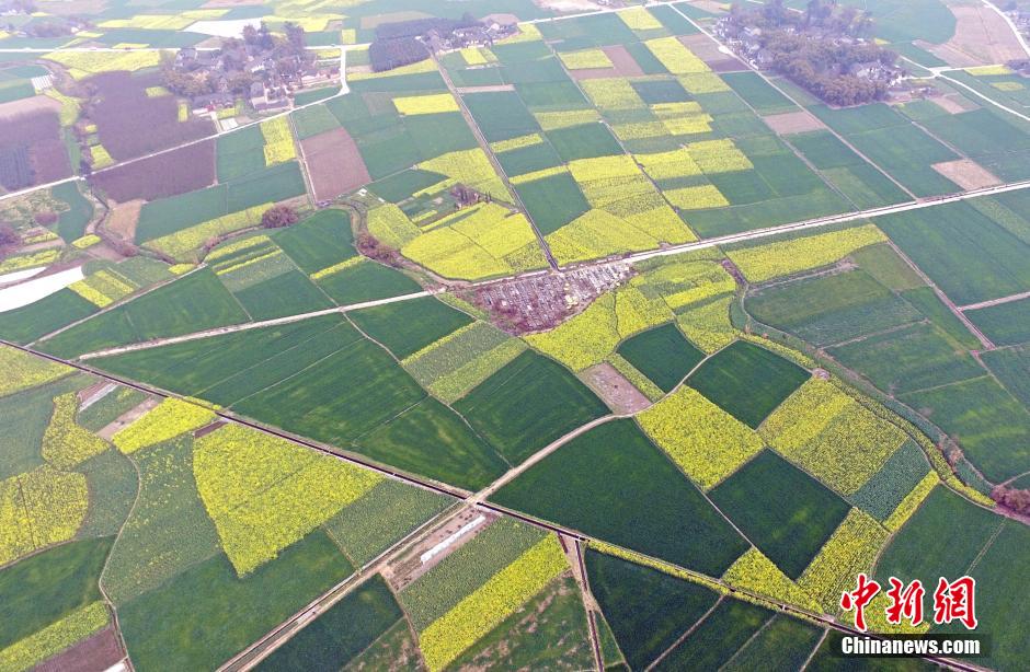Tourists are attracted by patterns of several famous cartoon figures in rapeseed flower fields in Xigao Town, Guanghan City of Sichuan Province. The cartoon figures include Doraemon, Hello Kitty, Minion and Baymax. There is also an image of a bronze man. When rape seedlings grew to 20 centimeters in height, those along the lines of the pattern were pulled out and wheat seedlings were planted in their place. The pattern took shape when spring came. [Photo from Chinanews.com]