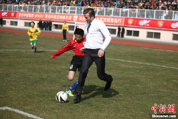 British soccer player David Beckham plays soccer with students at the Qingdao Tiantai Stadium in Qingdao, Shandong Province, March 22, 2013. Beckham visited Qingdao Jonoon Soccer Club as the ambassador for the youth football program in China and the Chinese Super League Friday. [Chinanews.com]