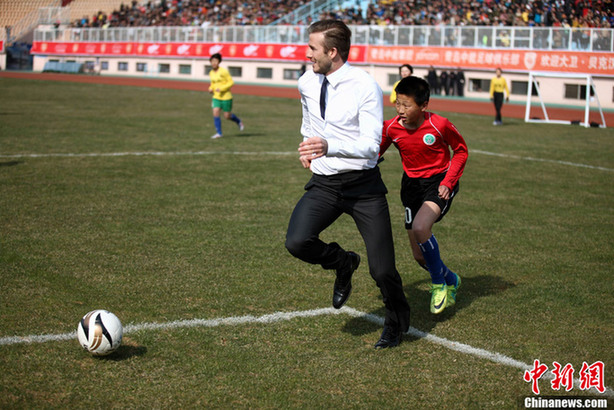 British soccer player David Beckham plays soccer with students at the Qingdao Tiantai Stadium in Qingdao, Shandong Province, March 22, 2013. Beckham visited Qingdao Jonoon Soccer Club as the ambassador for the youth football program in China and the Chinese Super League Friday. [Chinanews.com]