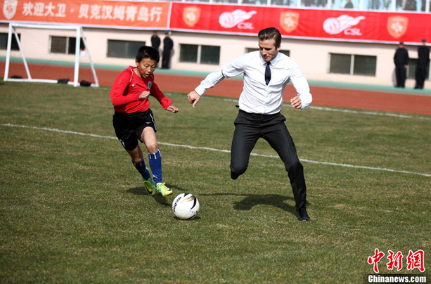 British soccer player David Beckham plays soccer with students at the Qingdao Tiantai Stadium in Qingdao, Shandong Province, March 22, 2013. Beckham visited Qingdao Jonoon Soccer Club as the ambassador for the youth football program in China and the Chinese Super League Friday. [Chinanews.com]