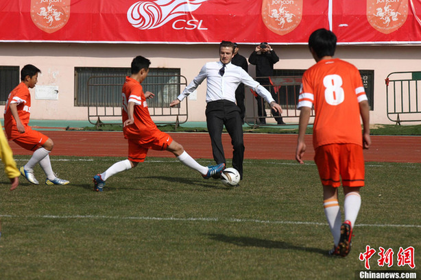 British soccer player David Beckham plays soccer with students at the Qingdao Tiantai Stadium in Qingdao, Shandong Province, March 22, 2013. Beckham visited Qingdao Jonoon Soccer Club as the ambassador for the youth football program in China and the Chinese Super League Friday. [Chinanews.com]