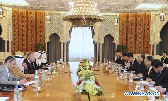Chinese Premier Wen Jiabao (3rd R) meets with Secretary General of the Organization of Islamic Cooperation Ekmeleddin Ihsanoglu (3rd L) in Riyadh, Saudi Arabia, Jan. 15, 2012. [Xinhua] |