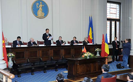 Visiting Chinese Vice President Xi Jinping (C) addresses a seminar marking the 60th anniversary of the establishment of the diplomatic ties between China and Romania, in Bucharest, capital of Romania, Oct. 20, 2009. [Xinhua] |