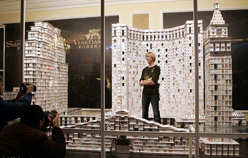 Photo shows American architect Bryan Berg and his houses of cards. [Photo: CRI Online] |