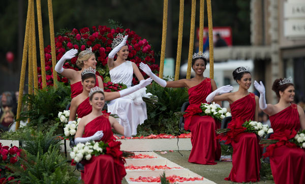 | Vanessa Natalie Manjarrez (C) reigns as Rose Queen during the 124th Annual Rose Parade in Pasadena, California, the United States, Jan. 1, 2013. The largest New Year celebration in the U.S. West was held here Tuesday morning with an estimated one million spectators watching the world famous Rose Parade along the 5.5-mile route and about 39 million viewers on television. [Yang Lei/Xinhua] |