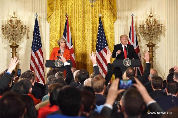U.S. President Donald Trump and British Prime Minister Theresa May hold a joint press conference at the White House in Washington D.C., the United States, Jan. 27, 2017. U.S. President Donald Trump said Friday that it is "very early" to talk about lifting sanctions on Russia in relation to the Ukraine crisis. (Xinhua/Yin Bogu) |