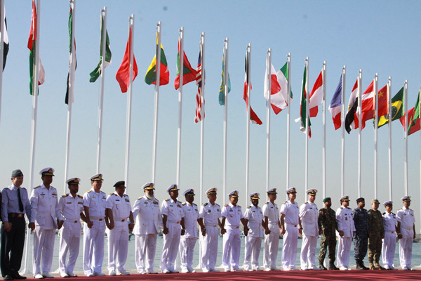 Officers take a group photo in front of their national flags at the opening ceremony of the Exercise AMAN-17 in Karachi, Pakistan, on Feb. 10, 2017. [China.org.cn / by Guo Xiaohong]