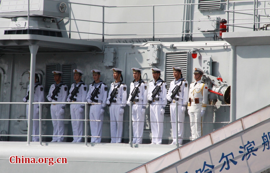 Soldiers on missile destroyer Harbin, in Karachi, Pakistan, on Feb.12, 2017. China's 24th escort naval fleet took part in the ongoing AMAN-17 multinational exercise with its missile destroyer Harbin, guided-missile frigate Handan and the supply ship Dongpinghu. It's the fifth time that China has joined AMAN exercise since its launch by Pakistan Navy in 2007. 37 countries participated in this year's exercise. [Photo by Guo Xiaohong/China.org.cn] |
