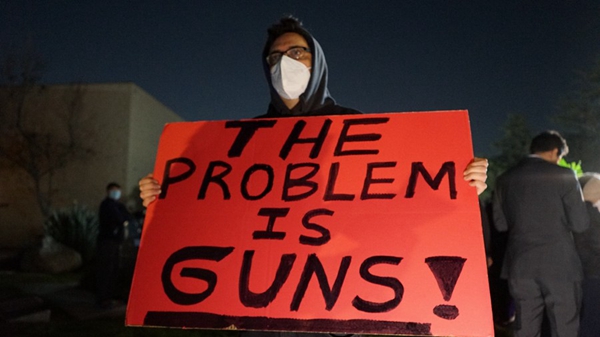 A man holds up a sign denouncing gun violence during a memorial for victims of a mass shooting at Monterey Park City Hall, California, the United States, Jan. 23, 2023. [Photo/Xinhua]