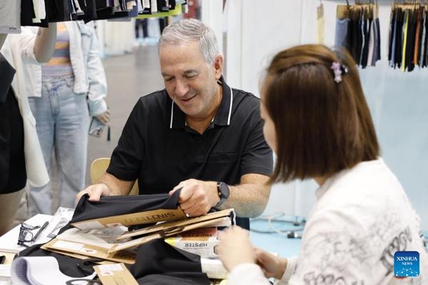 A client (L) selects fabric at a booth of an enterprise from China's Shanghai during the 24th China Textile and Apparel Trade Show in New York, the United States, on July 19, 2023. [Photo/Xinhua]