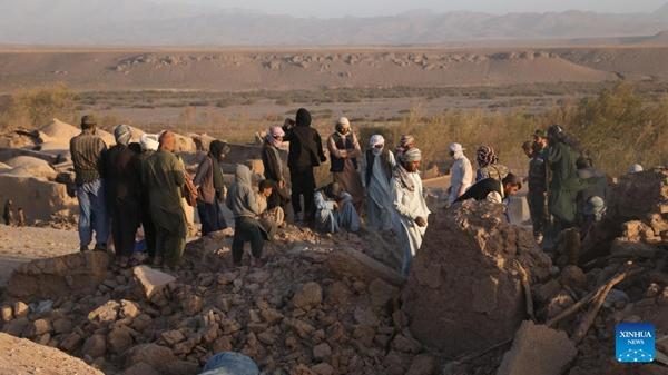 People are seen among ruins of dwellings after earthquakes in Herat Province, Afghanistan, Oct. 7, 2023. [Photo/Xinhua]