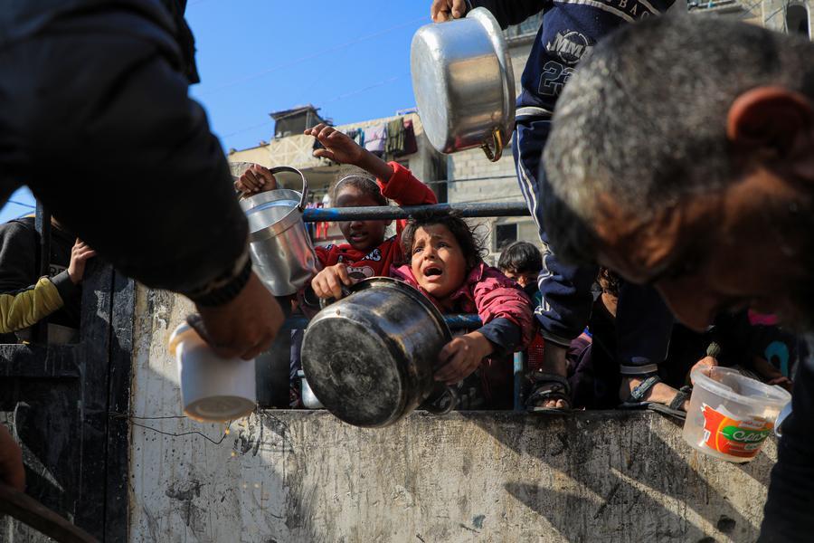 A Palestinian girl tries to get food relief in the southern Gaza Strip city of Rafah, on Dec. 31, 2023. [Photo/Xinhua]