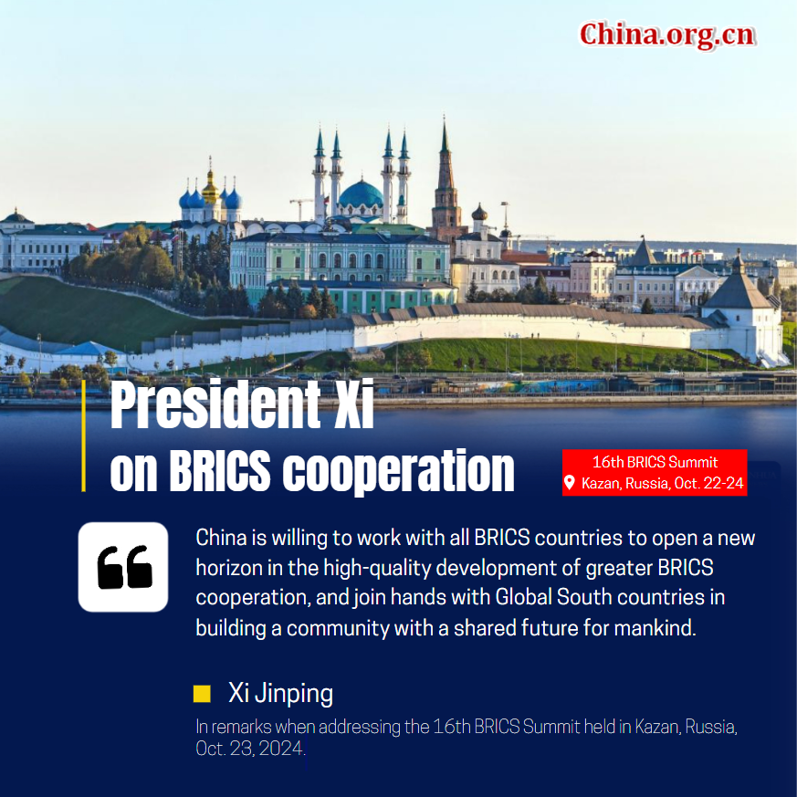 - During the 16th BRICS Summit in Kazan, Russia, Chinese President Xi Jinping had in-depth exchanges with leaders of other countries on the current international situation, BRICS cooperation, the development of the BRICS mechanism and important issues of common concern. Here, China.org.cn reviews highlights of President Xi's remarks.