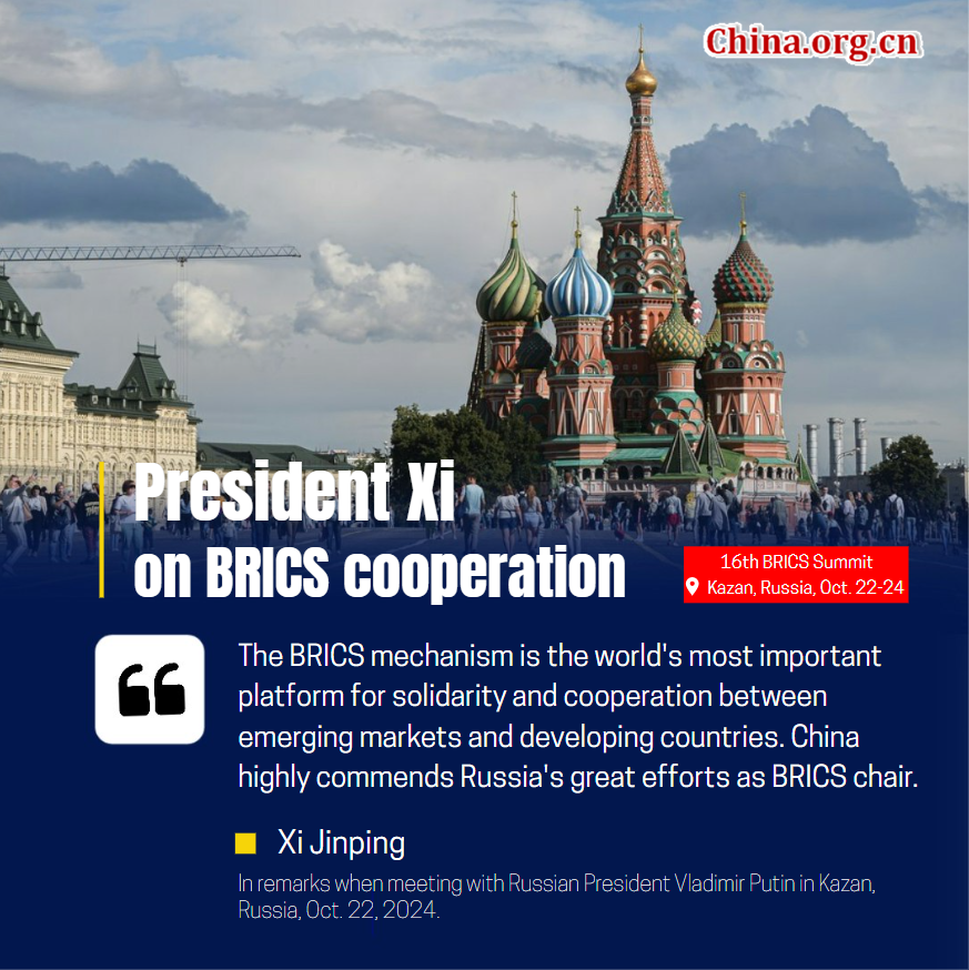 - During the 16th BRICS Summit in Kazan, Russia, Chinese President Xi Jinping had in-depth exchanges with leaders of other countries on the current international situation, BRICS cooperation, the development of the BRICS mechanism and important issues of common concern. Here, China.org.cn reviews highlights of President Xi's remarks.